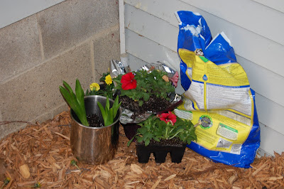The other day I was at Lowe's and saw some pretty flowers on sale and some hanging baskets. When I brought them home the girls were outside with their chalk. I told them I had a surprise and they could help out and they were so excited when they saw all the flowers. Chloe (the funny one) said: "Those are just divine!". They were cute little helpers.